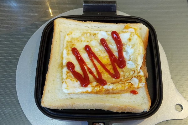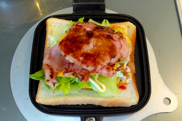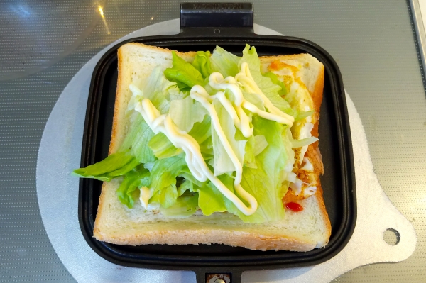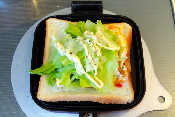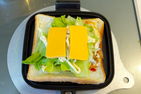 休日のホットサンド,オープンサンド ハムエッグレタスチェダーチーズ 2017-01-08 10:47:00 お歳暮のハムを使い切るためにハムが続きます。 毎回少量しか使っていないので。 材料 ・たまご 1個 ・ハム 適量 ・レタス 1枚〜2枚 ・チェダーチーズ 適量 1油を引いて、たまごを焼く 2マスタードを塗ったパンに乗せ、ケチャップをかける 3レタスを乗せて、マヨネーズと胡椒で味付けをする 4チェダーチーズと焼いたハムを乗せる 5焼いて出来上がり ハムとチーズの順番を間違えたようでチーズが溶けきれなかった。