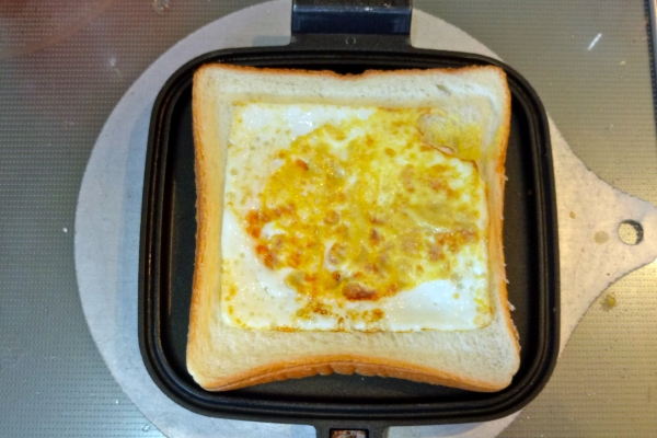たまごがホットサンドメーカーにこびり付くと厄介なので、端から軽くはがしておきます。