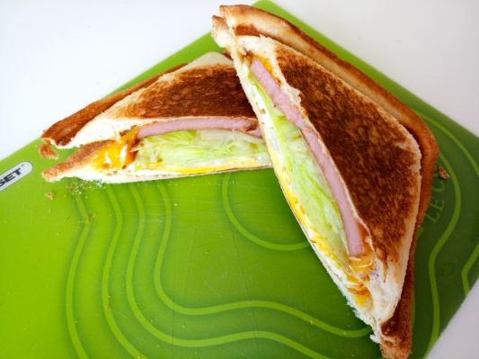 焼き肉のたれで絡めたハムにチーズと&たまごの組み合わせ お腹いっぱいになりました ・焼き肉のたれを絡めたハムステーキ ・レタス ・たまご ・チェダーチーズ 1、...