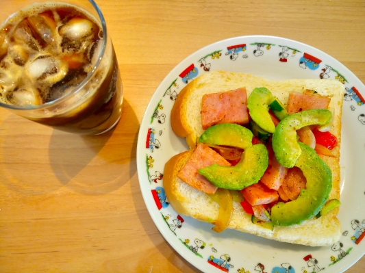のっけオープンサンド アボカドの緑色が映えて見た目が良い ・塩こしょうで焼いたハムステーキ ・ミニトマト 2個 ・玉ねぎ ・アボカド 1、ハムステーキ、ミニトマ...