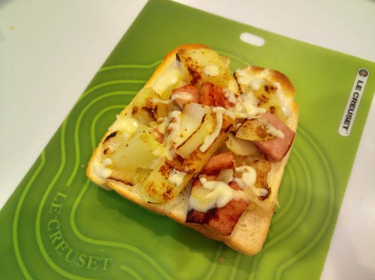 オープンサンドにも挑戦してみます パンは厚切りパンが似合います ・ジャガイモ 1個 ・玉ねぎ 半分 ・ハムステーキ 1枚 1、じゃがいも、玉ねぎ、ハムの大きさを揃えて切る...