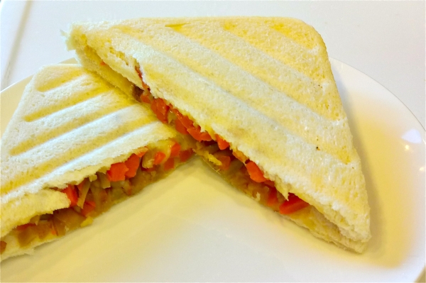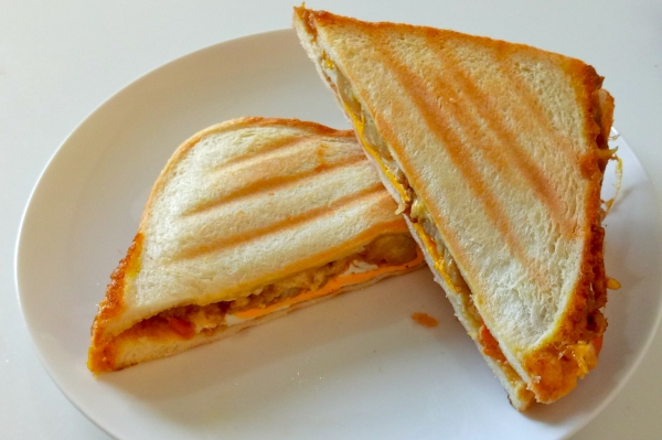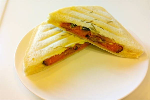 オリーブオイルとローズマリーでパニーニ風。 固くならないけど焼目がつかないのが残念です。 ■パン ふんわり食パンを2枚使用します。 ■具材 ・自家製カボチャサラダ ・溶...